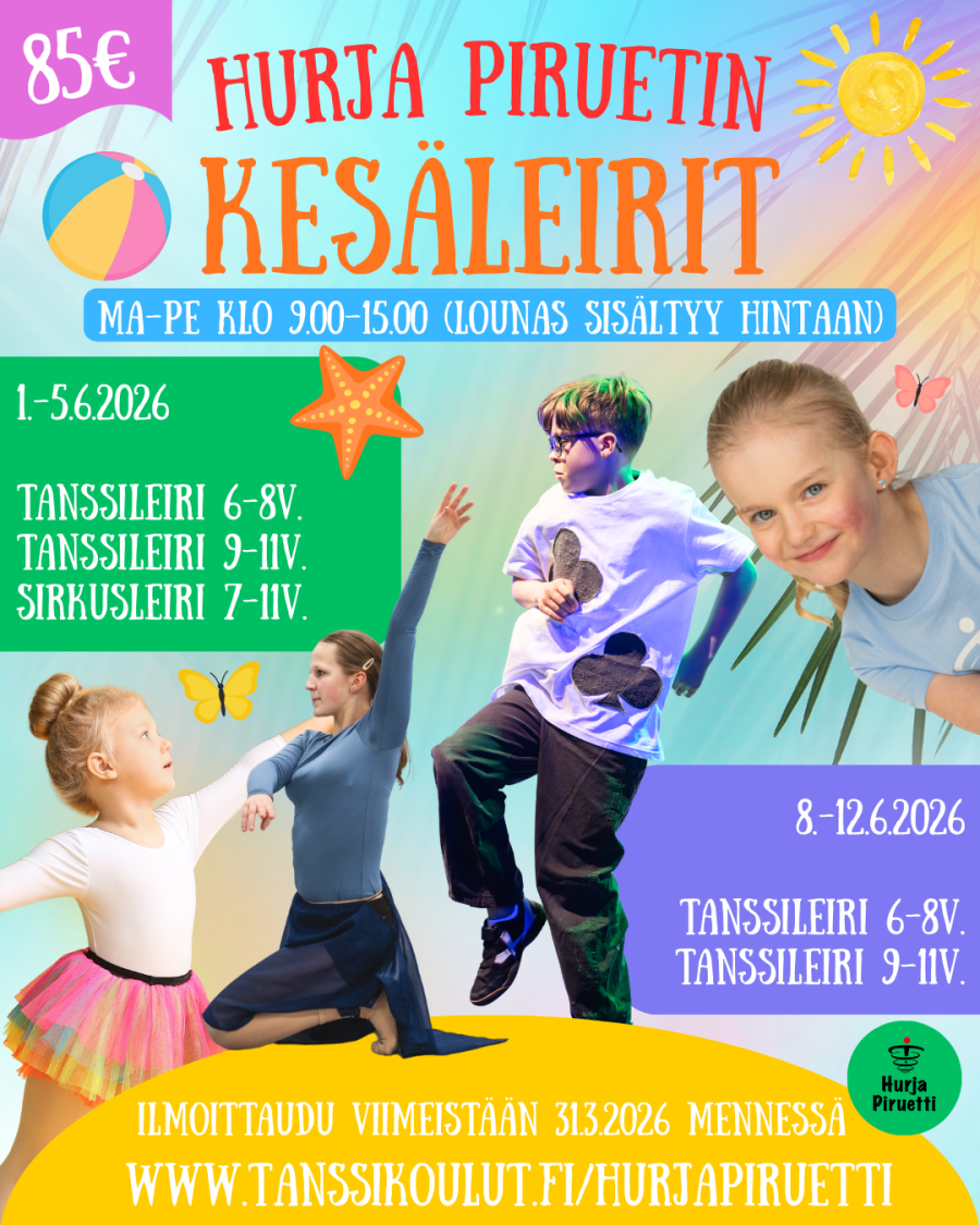 Tarkempi leiriohjelma lähetetään leiriläisille myöhemmin. Ilmoittautuminen: www.tanssikoulut.fi/hurjapiruetti